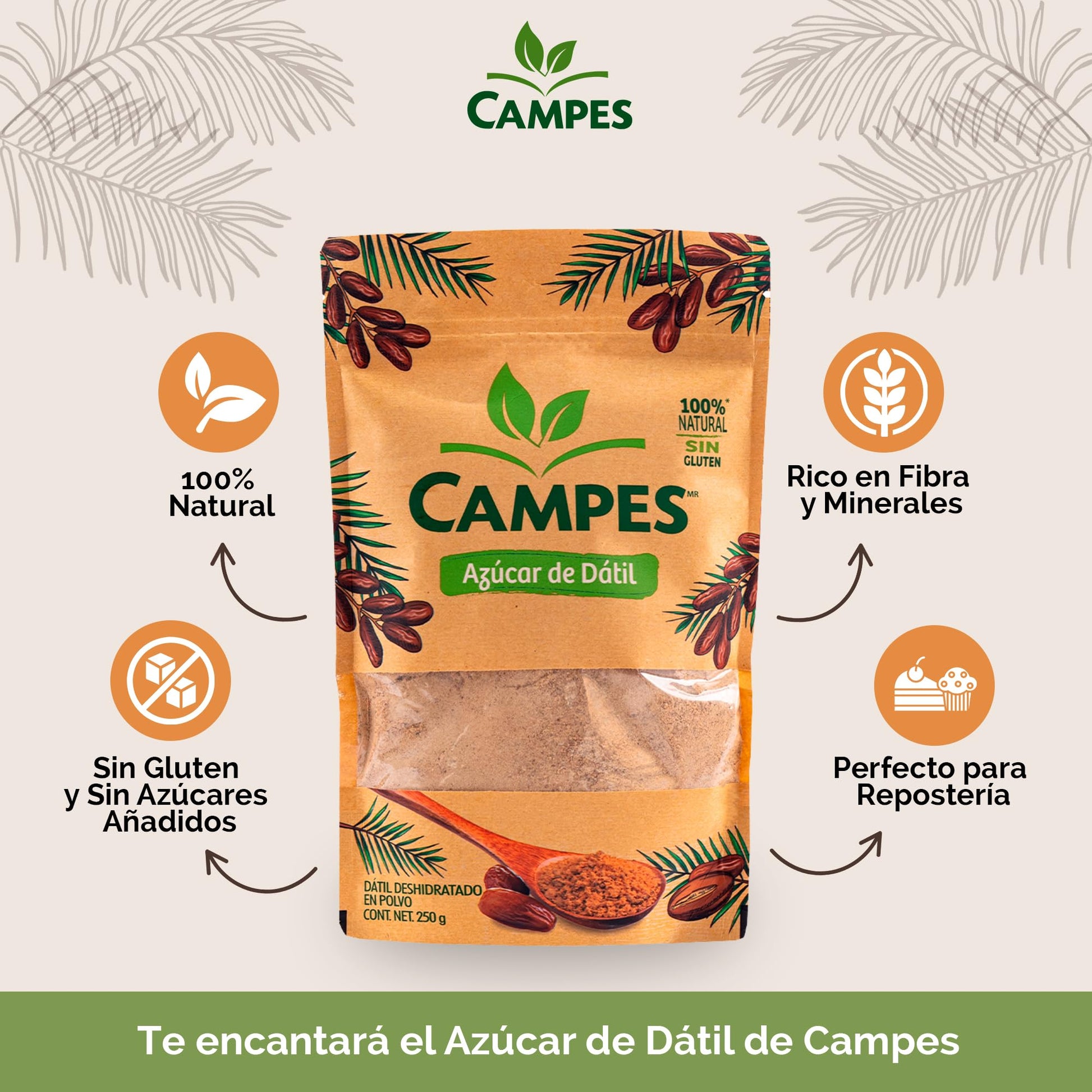 Campes Azúcar de Dátil 250g - Edulcorante Natural de Dátiles - Sustituto de Azúcar Saludable - Sin Gluten ni Azúcar Refinada - Ideal para Endulzar Bebidas y Postres
