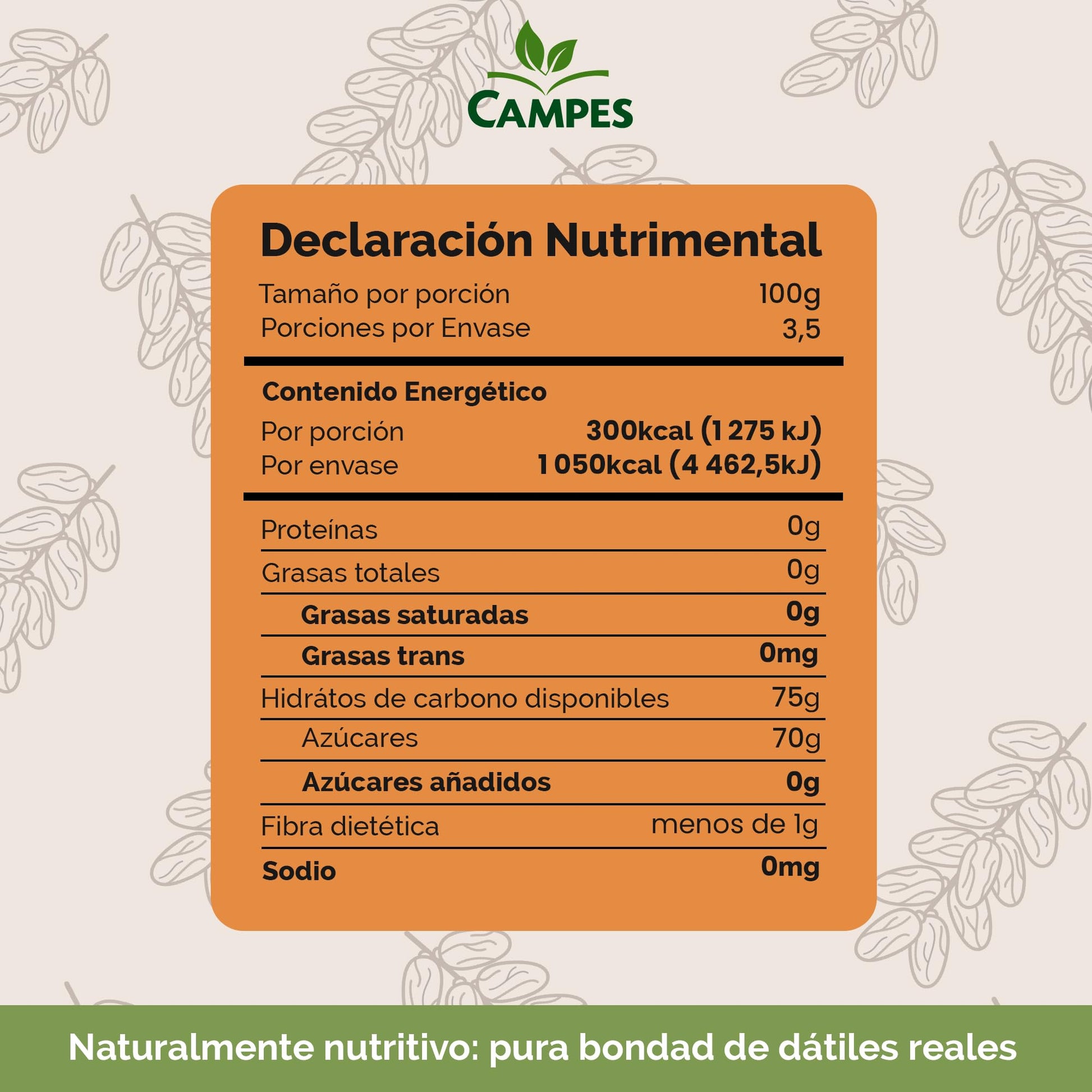 Detalles: Miel de datil Campes es apto para personas con diabetes, Al ser un producto 100% natural podrás disfrutar de todos los beneficios del dátil, alto en fibra y antioxidantes.